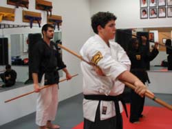 Students practice with the bo, a six-foot wooden stick A student practices an advanced nunchuku kata, using |